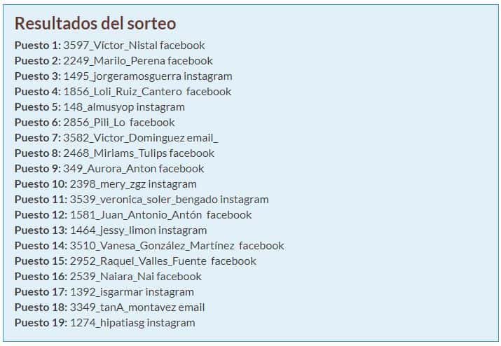 UPDATE: Estos son los ganadores del sorteo. Como comentábamos los 9 ganadores tienen su premio asignado. Los suplentes comienzan a partir del número 10 EN RIGUROSO ORDEN DE LISTA.